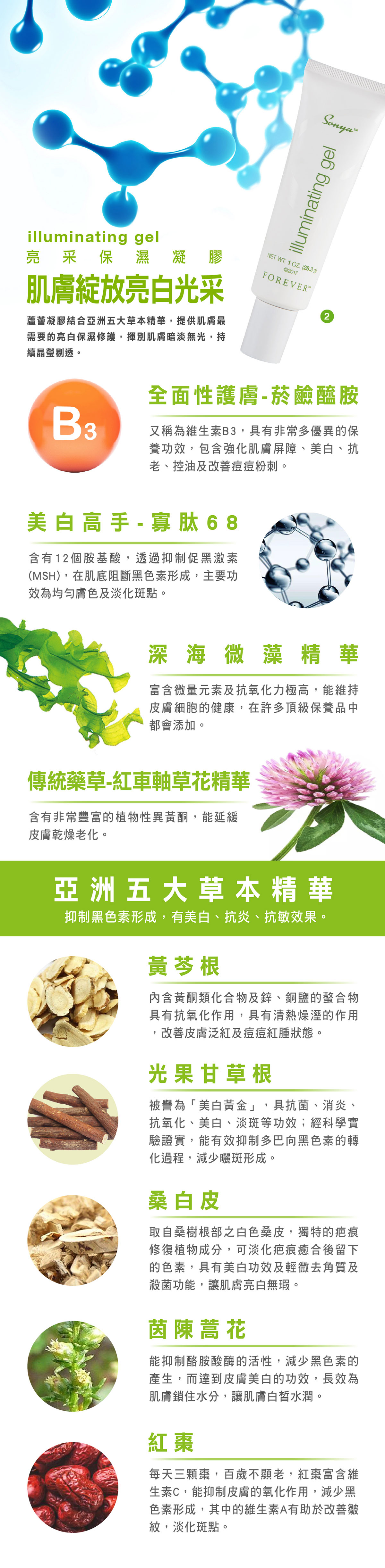 富含蘆薈、卵磷脂及多種海藻精華保濕柔嫩肌膚,紅車軸草花精華有效緊緻毛孔。寡胜肽-68及五大亞洲草本精華的結合,均勻明亮膚色,散發健康光澤。